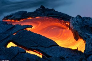 This photo of a river of lava flowing from the Kilauea Volcano was taken by Miles Morgan just before dawn in Hawaii. This image captures the different layers of lava that form from various cooling rates throughout the river. As the layers of lava on the flow front cool they become more viscous and their flow rate reduces. The other layers of lava compress this flow front giving us the folds on volcanic rock that we can see in this picture