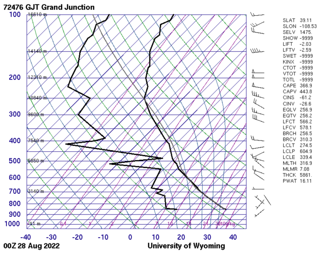 Below: Skew-T diagram for Grand Junction, 00Z 8/28/2022, which was the closest to the time/location that this photo was taken. The clouds are likely to exist around 5900 meters because that is where the dew point and temperatures are closest. The CAPE value at this time was 366.9, so at the time the weather was slightly unstable. The clouds in this photo are probably cumulus and stratocumulus clouds, and are pretty standard for this location/time of year.