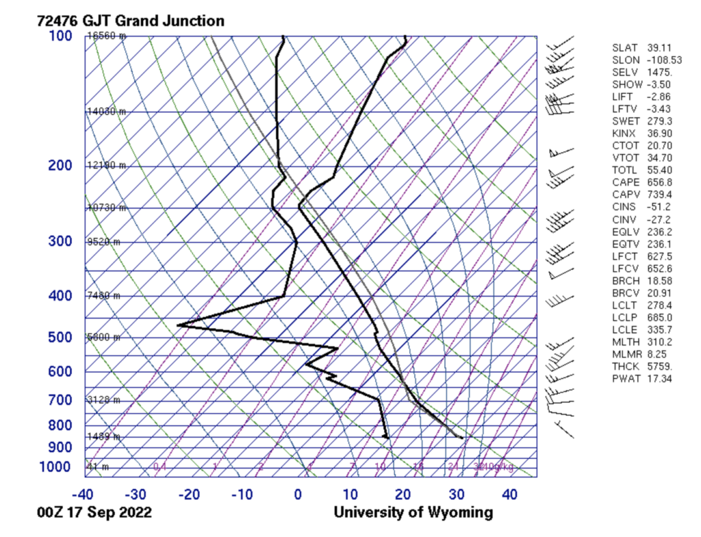 The skew T shows a CAPE of 656.6 indicating severe atmospheric instability, which agrees with my observation of the storm. The clouds in the foreground are cumulus congestus and the clouds in the background are likely altocumulus, even though the skew T shows the upper clouds being in the realm you would expect to find cirrus clouds.