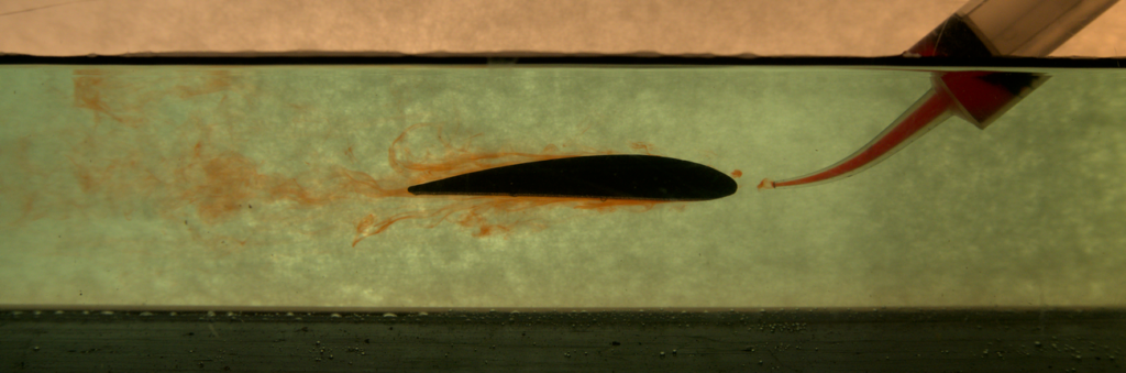 This is an image of a green food coloring dye injected in a water filled flume passing over a submerged airfoil. The airfoil is attached to the far side of the flume from the camera. The dye was diluted with water and injected into the flow path via a needle syringe which was removed before the image was captured. The flow in this image was relatively slow in order to produce a low Reynolds Number in the water, producing a more laminar flow of dye and water around the airfoil which better visualizes the fluid boundary layers and velocities around it.