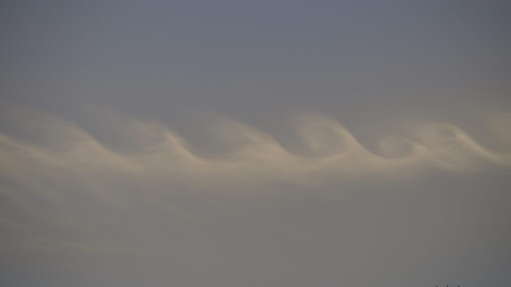 This image features an altostratus fluctus cloud produced by a Kelvin-Helmholtz instabilty. The air above the fluctus appears to be moving to the left of the image (from the west-southwest).