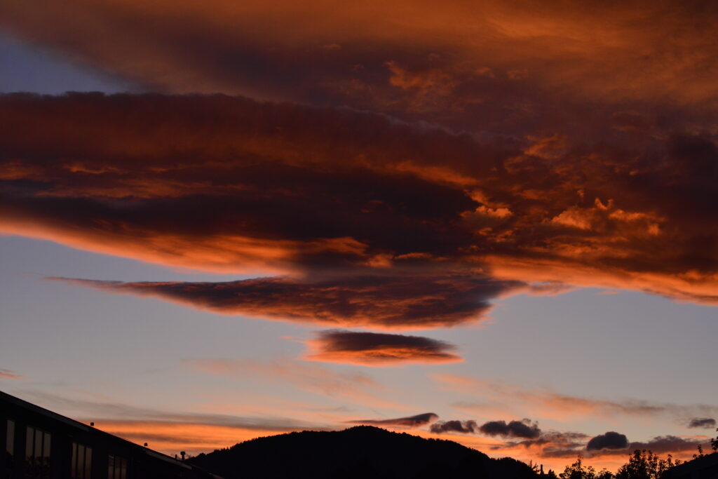The red and orange hue of the clouds from the setting sun with the dull bluish sky makes this a visually striking image. I like how the details on the clouds is visible and that you also included the mountain range in the frame which gives it a scale and perspective.