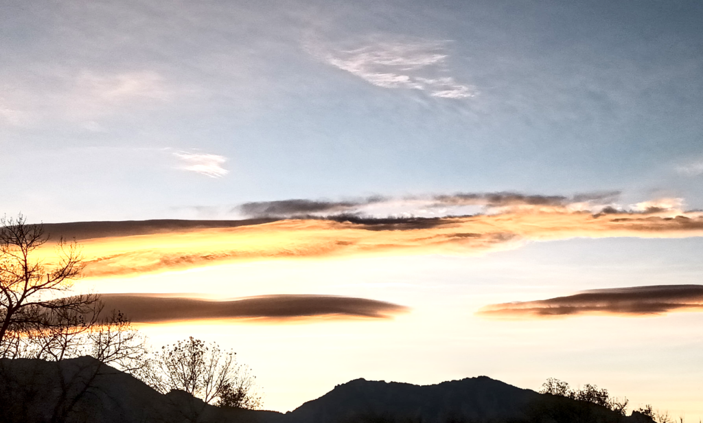 This cloud image captures altocumulus lenticular clouds and cirrus clouds. Lenticular clouds are big and shaped like lenses. These clouds form because of the winds near the mountains. The thin, wispy cirrus clouds, add a delicate feel to the overall scene. The report explores the details of this captured moment, looking into the science behind the way light, air, and clouds work together to create a timeless and beautiful picture of nature.