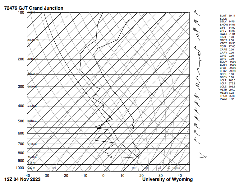 Skew-T plot for 4th November 2023, 6 pm at Grand Junction, Colorado