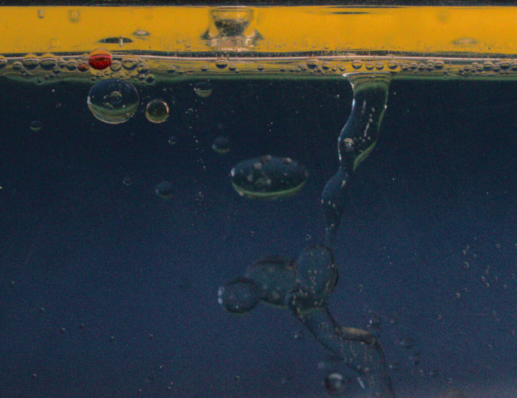 This photo captures oil and water, bubbles are migrating to the top after they have been poured into the water from above. The polarized water molecules stick to each other while the nonpolarized oil molecules stick to each other. The water sinks to the bottom due to its greater density.