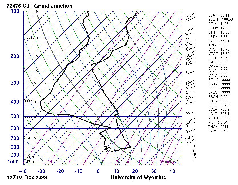 Taken on Dec 7 at 12:15 pm outside the CU Events Center, this image depicts the leading edge of storm front that is soon to roll in over the next couple days. The clouds in this image are primarily composed of stratocumulus clouds. This image was shot on my IPhone 12 Pro with a 26mm f/1.6 lens at a shutter speed of 1/4651s and an ISO of 32. Included in the post is the 12Z Skew-T plot from the University of Wyoming atmospheric sounding station in Grand Junction.