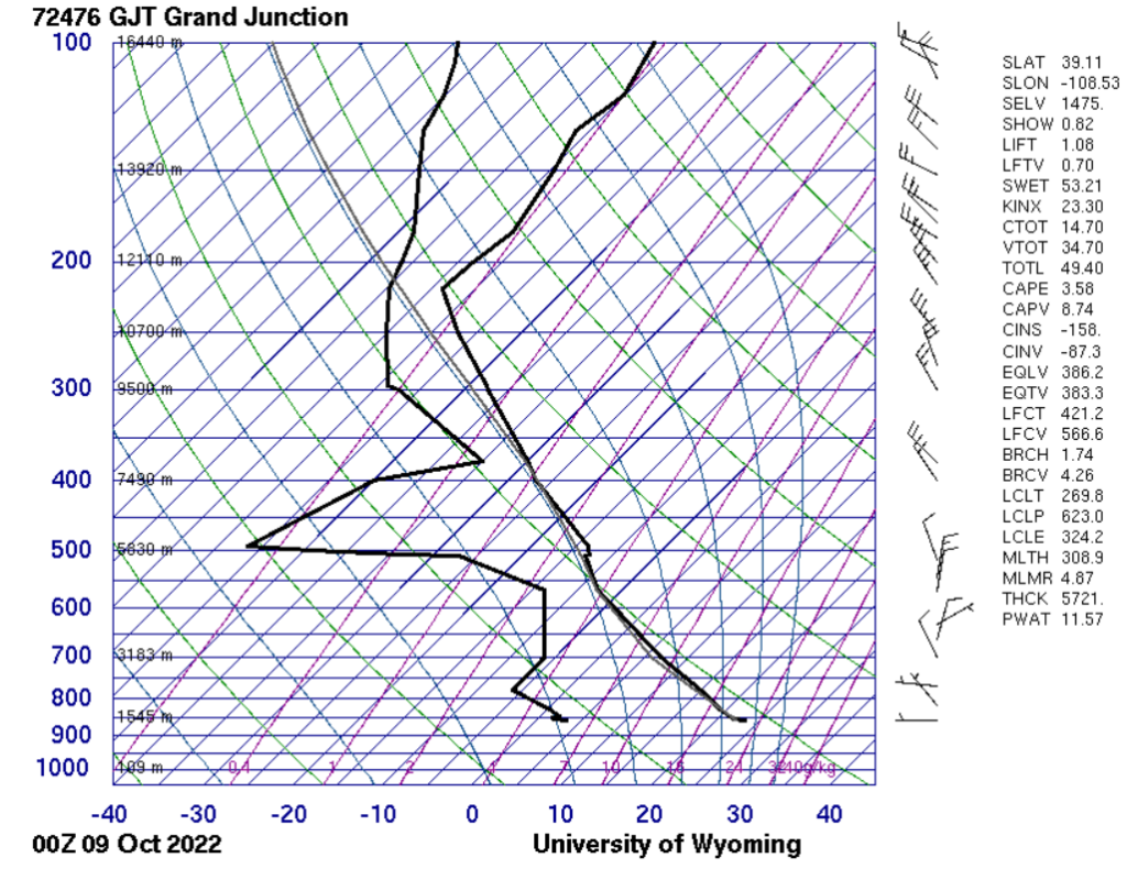 Cumulus congestus and stratocumulus clouds above Gilpin County, Colorado, spotted 10/8/2022. The Skew-T diagram below from Grand Junction suggests that the clouds likely occurred around 4000m or between about 7500m to 12000m, and it also reports a CAPE value of only 3.58, which suggests a conditionally stable troposphere, which likely differs from what I observed, as a towering cumulus such as this one is more likely to occur in a less stable atmosphere.