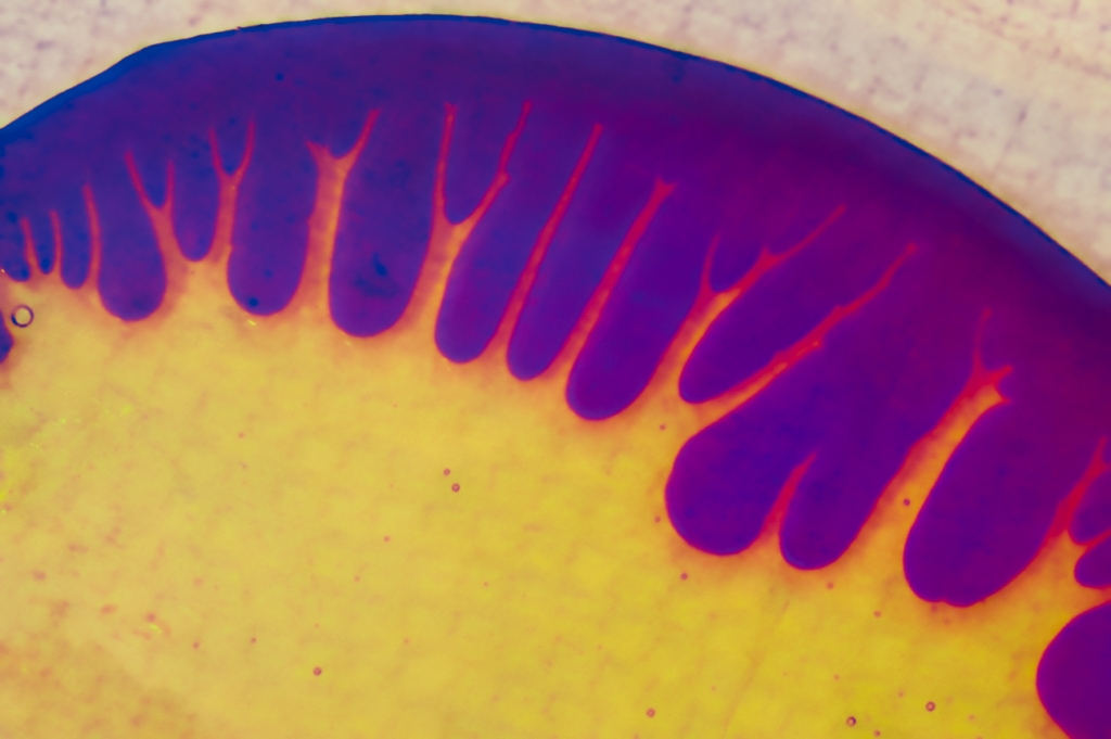 This image shows a multitude of Saffman-Taylor instabilities of dyed water (less viscous fluid) through honey (more viscous fluid). Originally injected through a hole in the top plate of a Hele-Shaw cell into the center of the honey, the water formed Saffman-Taylor instabilities emanating outward radially. However, after the water reached the end boundary of the honey it burst out and quickly surrounded the honey. When the injection syringe was removed, the change in pressure pulled water back into the honey, creating Saffman-Taylor instabilities directed radially inward, an effect I thought was unique compared to a typical Hele-Shaw cell experiment.