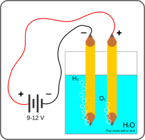Figure 4 shows a simple demonstration setup using the graphite in pencils as both the cathode and anode, but in flow visualization, a thin wire is used for the negatively-charged cathode, where hydrogen is generated, while a larger, sturdier anode (where oxygen is generated) is placed downstream of the region of interest. Steel wire of 2 mm diameter can be used for the cathode but finer (< 1µm) platinum wire is preferred . Smaller diameter wire is better because the bubble diameters are on the order of the wire diameter, and smaller bubbles will have less buoyancy. Platinum is better than steel; it is less vulnerable to corrosion and ductile enough to be formed into smaller diameters. However, smaller diameter wires are much more fragile, so you’ll have to experiment to find the best combination of parameters.
