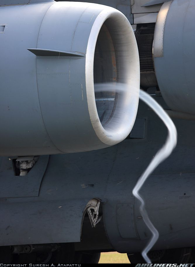 Nice submission Daniel. This is a great example of a turbofan ingesting the ground vortex. When a jet engine operates near the ground and there is not a large crosswind a ground vortex which ends at the fan will always be present. What makes this photo so unique is that the conditions in the local atmosphere (specifically relative humidity and dew point) were just right that the drop in pressure in the vortex was able to cause the water vapor to condense making the vortex visible. The ground vortex is actually a problem in jet engine design because it produces a periodic forcing on the fan blades as they pass by the vortex. That periodic forcing poses structural risks if the fan and inlet are not well designed. During jet engine design validation a test is actually run where the engineers mount a large plate called a “ground plane” under the engine on the test stand to simulate the effect of the ground and the ground vortex.