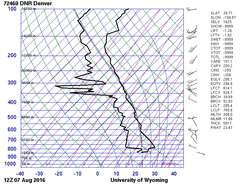 You can learn a lot about the clouds you are taking pictures of by looking at a few simple plots from the University of Wyoming’s weather site. You pick your location and it gives you a plot with a lot of different information. The main number we look at is the cape number. This picture was taken facing east from about us-36 and mcCaslin Bouldevard which is just slightly south east of Boulder Colorado. The cape number on my date, August 30th, 2016, is 157.1 which is well above the limit for having a stable atmosphere. Unstable atmospheres are what allow giant cumulus clouds to be formed. The differences in densities of different layers of air let the less dense air rise up while carrying moisture, which condenses and becomes there towering cumulus like we see here. These may be in the more developed stage of towering cumulus but all the same they are towering cumulus. They are very beautiful clouds with many different curls and lumps. There are assorted clouds in front of the towering cumulus that give the picture some good contrast and I especially like the dark spots beneath the clouds which are very interesting to me as well.