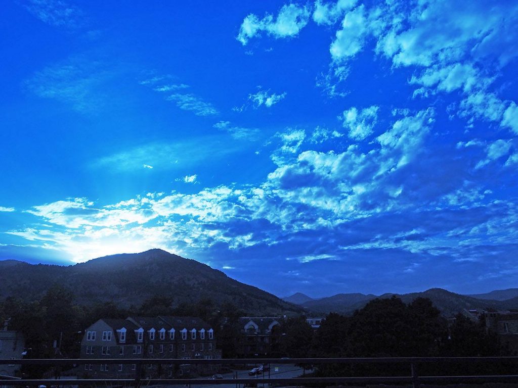 The sky looks pretty blue! With the sunset the cloud become whiter. Beautiful photo of CU campus.