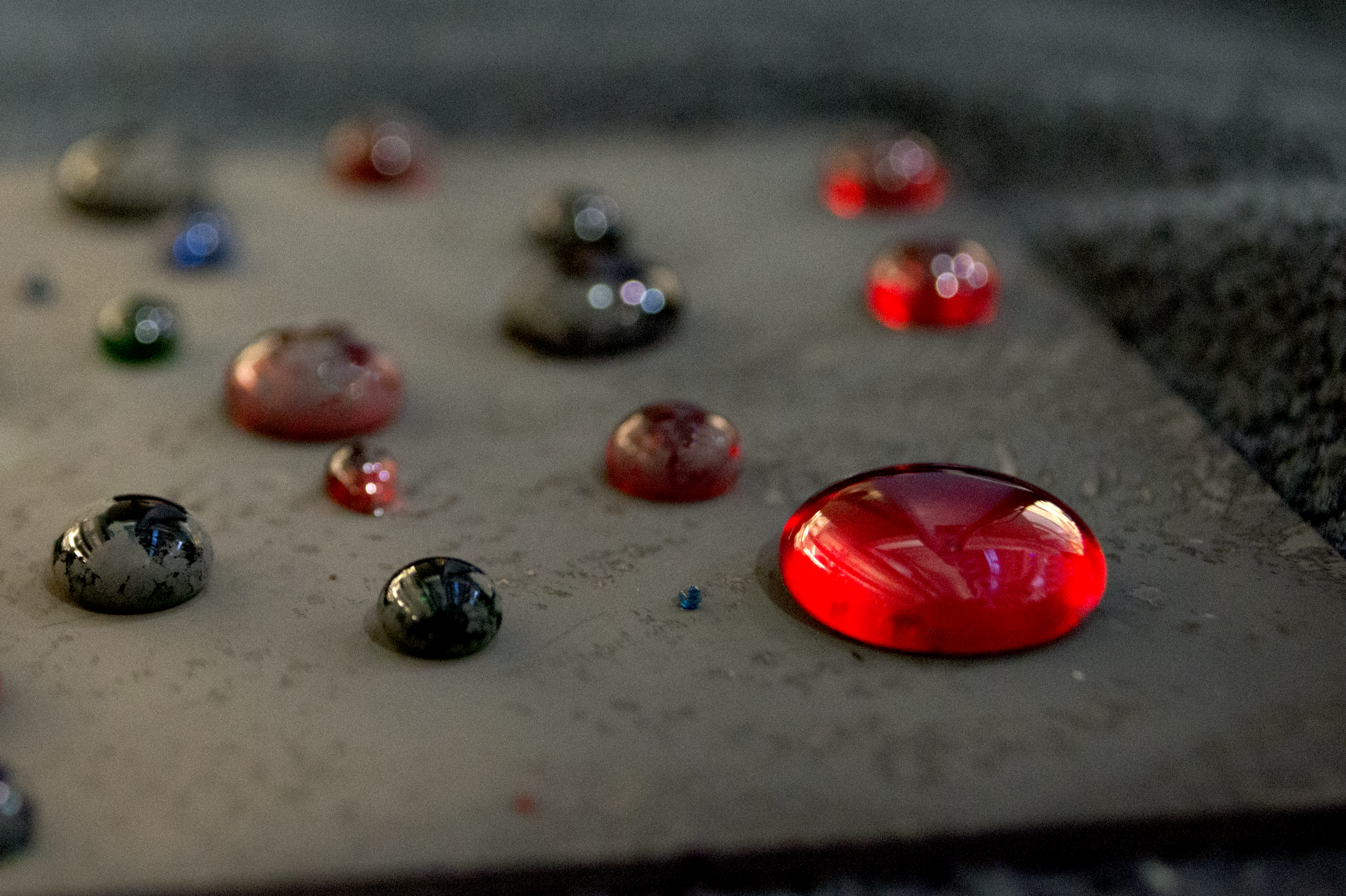 Very interesting, this sounded like a pretty easy and affordable way to make a superhydrophobic surface! There were a couple seminars a few weeks ago that talked about similar experimentation which got me interested in the topic, but they made it sound pretty difficult to make superhydrophobic surfaces. I really like your artistic effects also, with one large red droplet (which looks like a bead from Mancala) and smaller black droplets with the matte isopropyl soot on them. Great idea and incredible job!