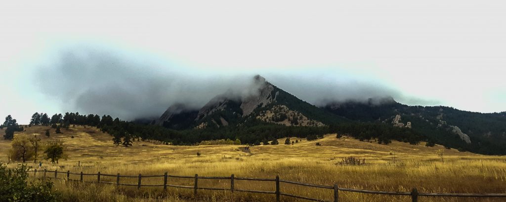 I really enjoy this image. The hovering cloud/fog around the flatirons gives it a mysterious feel. This reminds me of movies where they show their destination and the lurking danger they will entail as they move towards the mountains. The golden grass is a fantastic touch.