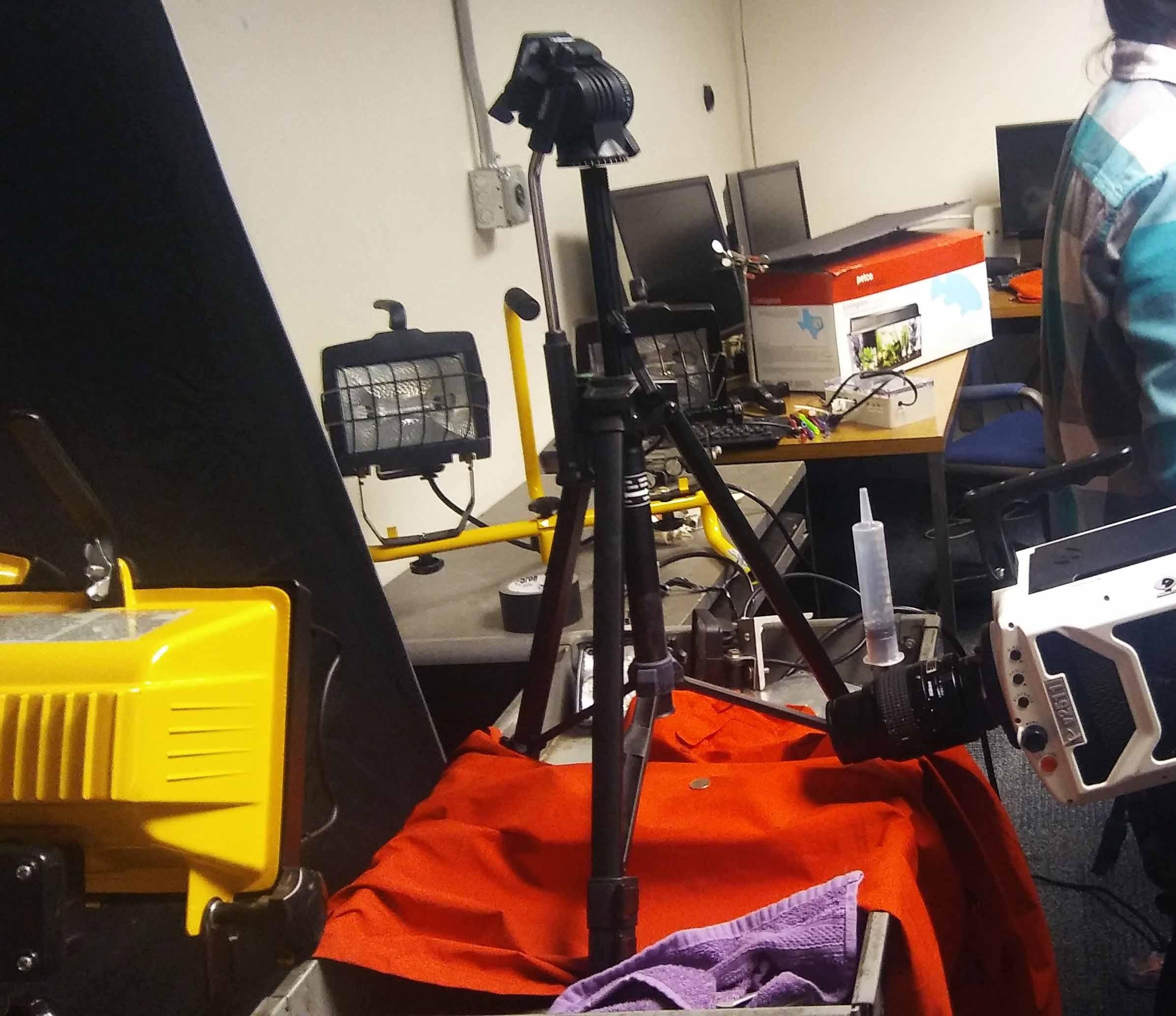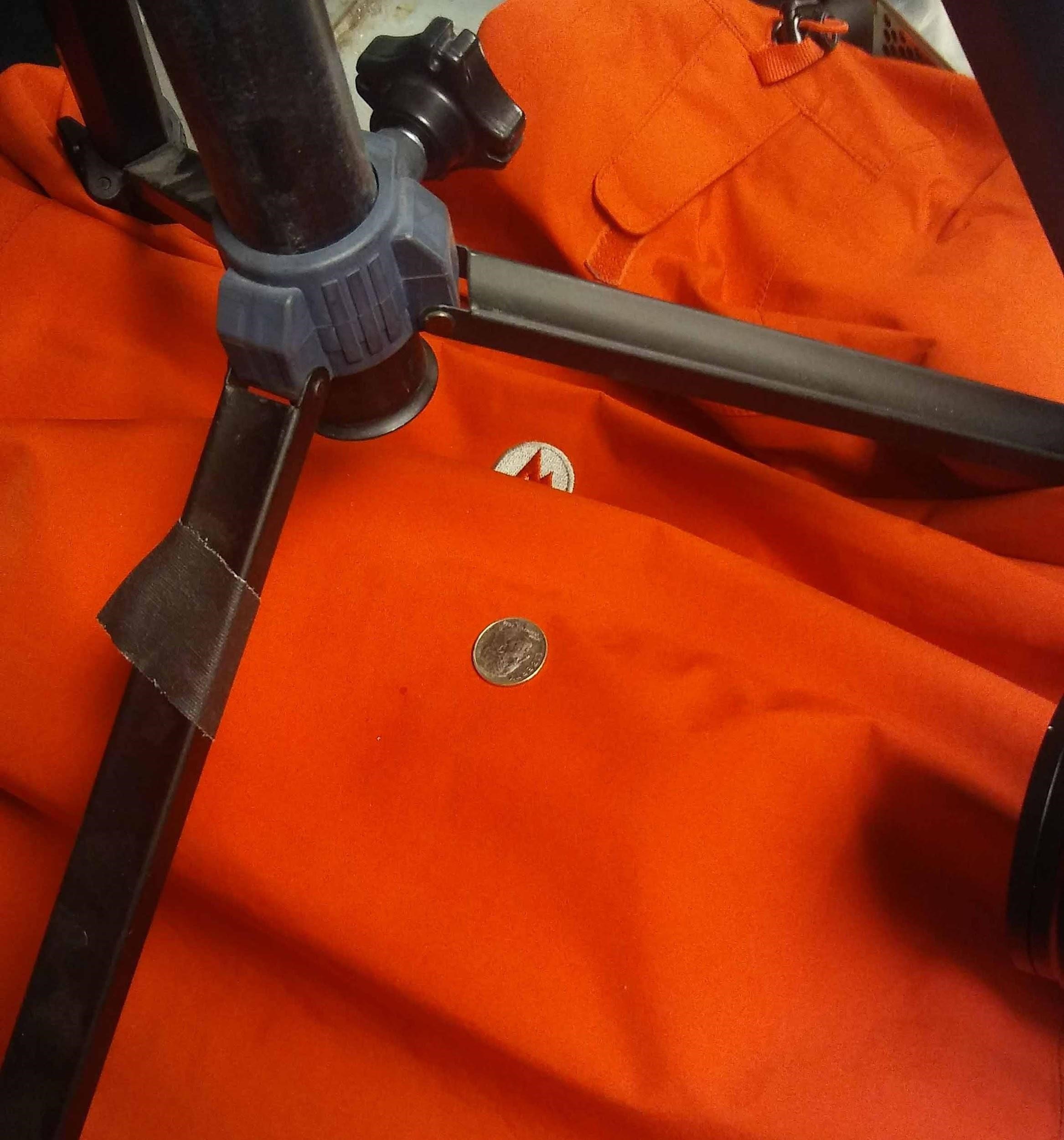 All of the photography completed for this assignment was captured in Prof. Hertzberg’s lab. The team laid the jacket across a cart such that the surface in the FOV for the camera was relatively flat. Next, the team set up a tripod over the surface to regulate the drop height and ensure that the drops would splash in the same spot (using reference tape) on the jacket to preserve the focus of the camera. Lighting was achieved through 2 sources; one lamp to the left of the apparatus at 120 degrees behind the drop zone and one held by a team member on the right close to the drop zone from 120 degrees in the back. For my submission, a cardboard box was placed under the jacket and angled to 45 degrees to achieve rolling droplets. Figure 1 shows the setup of the apparatus. Figure 2 is a picture of the tripod with a dime for scale. Figure 3 shows the setup before the tripod is added.