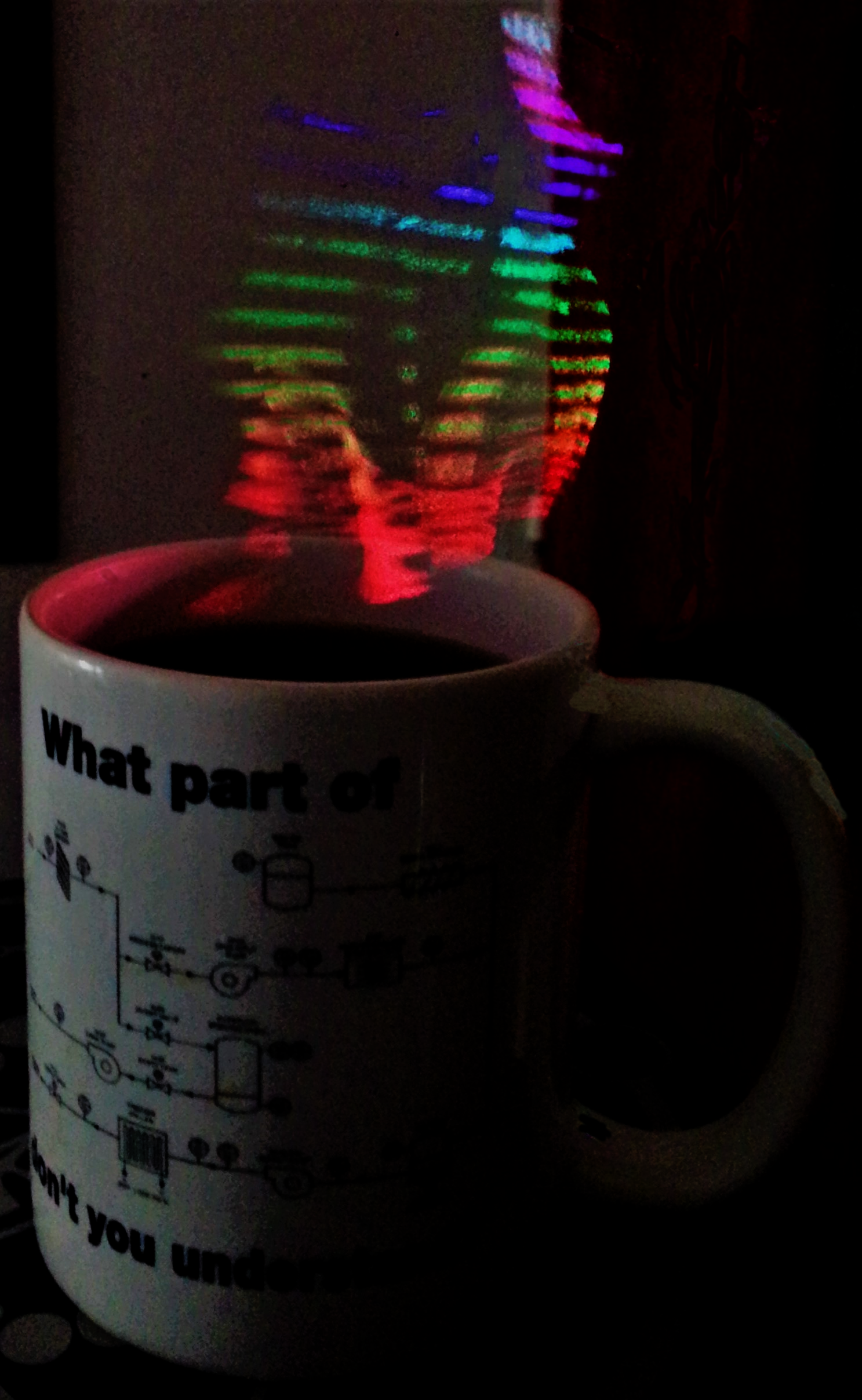 Laser coffee! very cool visualization! Cool to see the steam coming off the top of the coffee. thats my mug