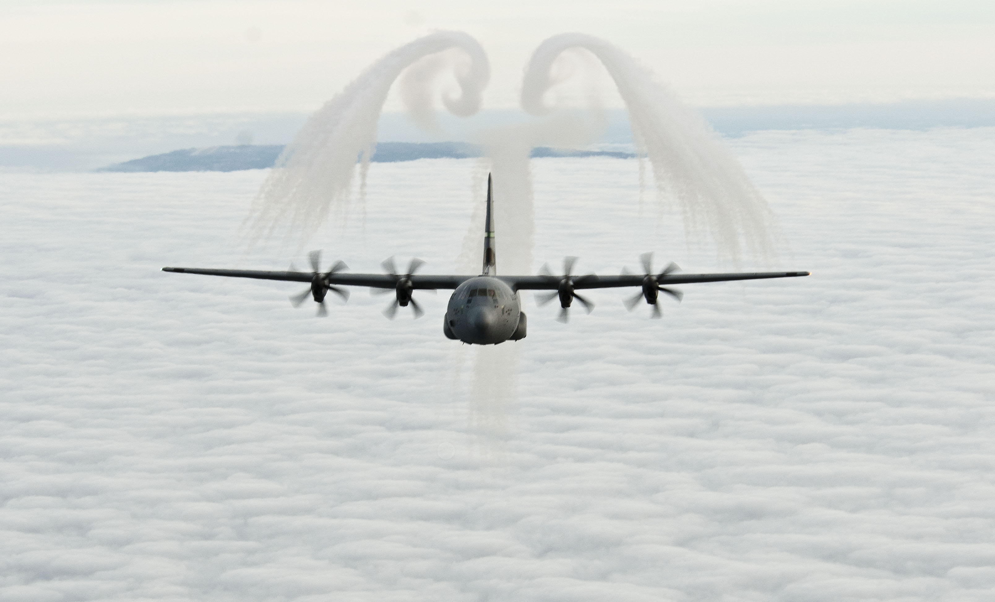 This image depicts a United States Air Force C-130J dispensing flares on a training mission.