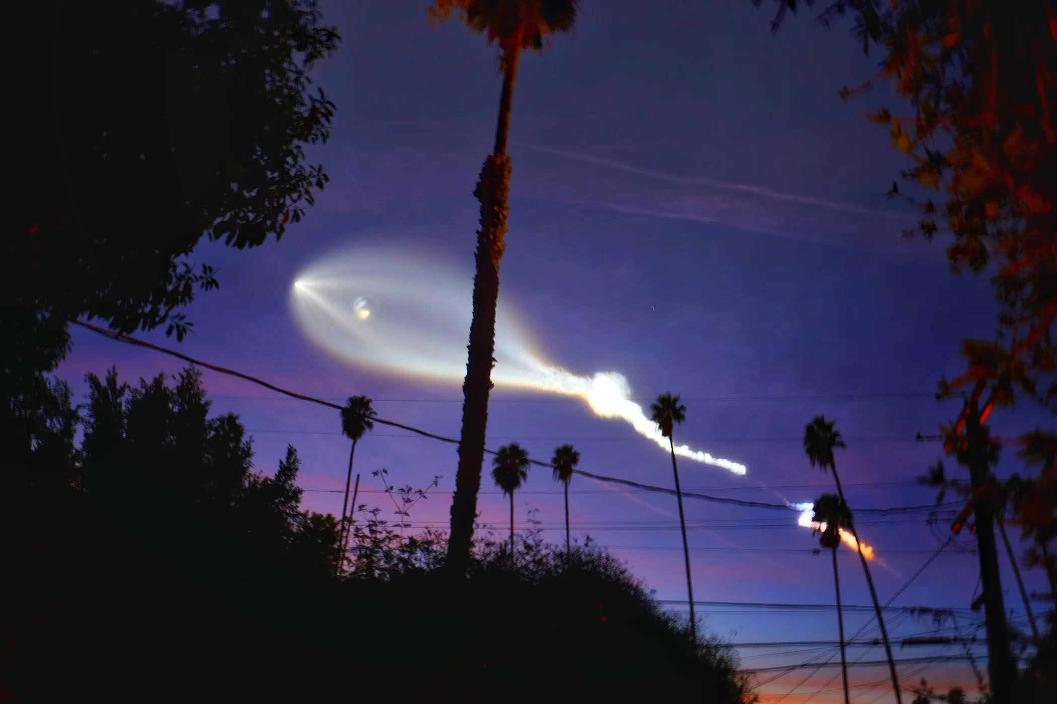 The event pictured is the launch of a SpaceX Falcon 9 rocket from Vandenberg Air Force Base on December 22, 2017, taken from Hollywood, California right as the sun was setting. The occurrence of the ghostly white halo effect pictured is due to water vapor in engine exhaust being ejected at high altitudes with extremely cold temperatures. Impurities allow for the creation of a condensation trail, not unlike those that form behind airplanes at high altitude.
