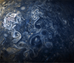 This is an image of atmospheric currents on Jupiter. The image, which has been color-enhanced, details a cloud system in the planet’s northern hemisphere. This image was taken by NASA’s Juno spacecraft on October 24, 2017, from a distance of 11,747 miles from the top of the clouds. What I like most about this image is the grand scale of the image, as each pixel (at full resolution) is approximately 7.75 miles/pixel. Additionally, note the depth of the image.. whiter clouds are at higher altitude, and cast shadows on the layers below.