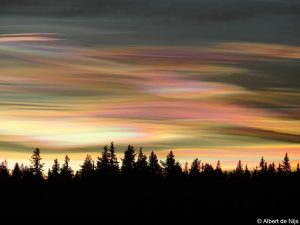 Nacreous, or Mother of Pearl Clouds are comprised of tiny ice crystals and form in the stratosphere. They are mostly found in the polar regions as a temperature around -85 °C is needed for them form. During the day, they look like high cirrus or lenticular clouds, and only become colorful after the sun has set. Once the sun dips a few degrees below the horizon, the ice crystals reflect the light, giving the clouds an iridescent appearance. Once the angle of the sun increases, the clouds become more uniformly colored.