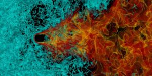 This image shows the ignition of premixed hydrogen and air about a hot rod. Interesting phenomena are present, such as intense, swirling eddies near the ignition, and boundary interactions due to the non-laminar Reynolds numbers which range from 100-500.