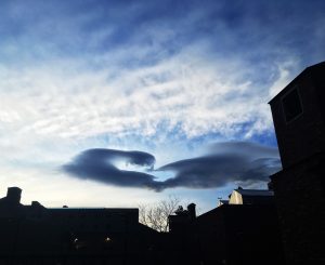 I took this photo on a iPhone SE after class at 5pm after the sun dipped bellow the mountains. I was holding my phone at 30 degrees pointing at the sky and the horizon of the mountains. The cloud was west of where I was standing, in the courtyard between atlas and the Visual art complex. The framing of the horizon show the green houses on the biochemistry building and the roof of the UMC. The use of an iPhone meant I didn’t get an archival tiff.