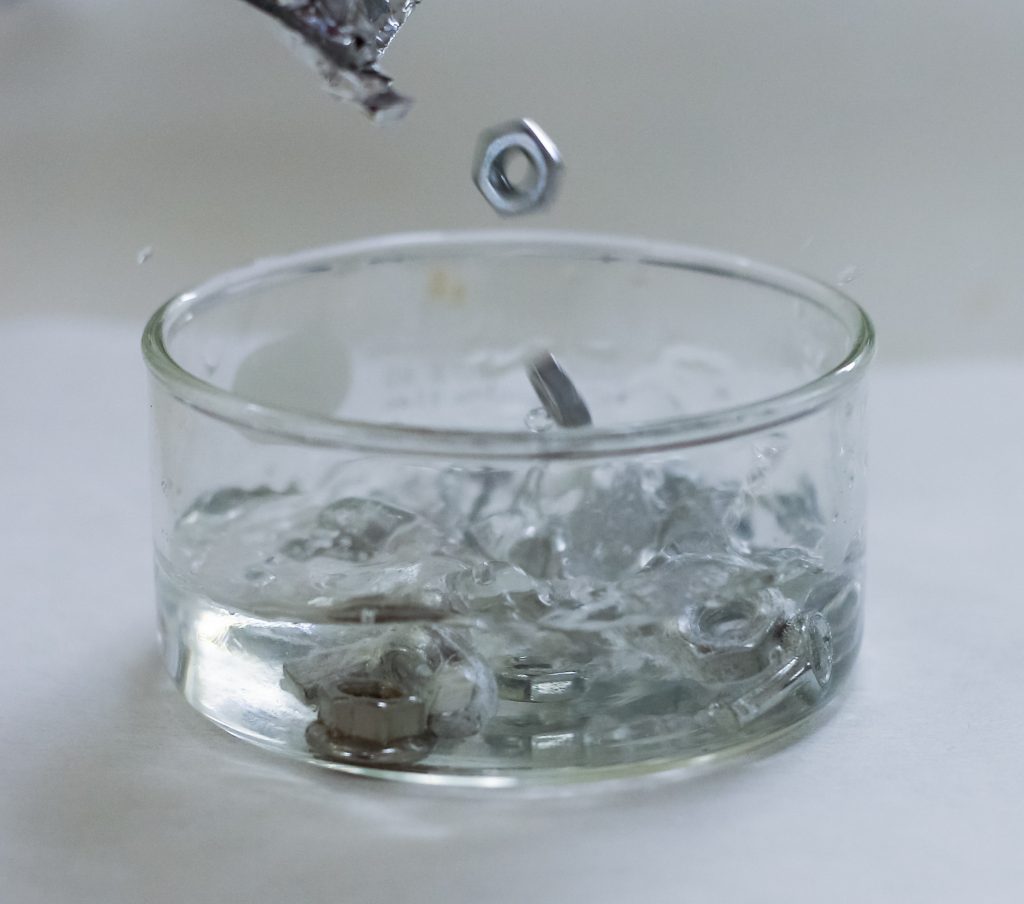 Steel nuts were heated and dropped directly into water, creating turbulence and steam within the water.