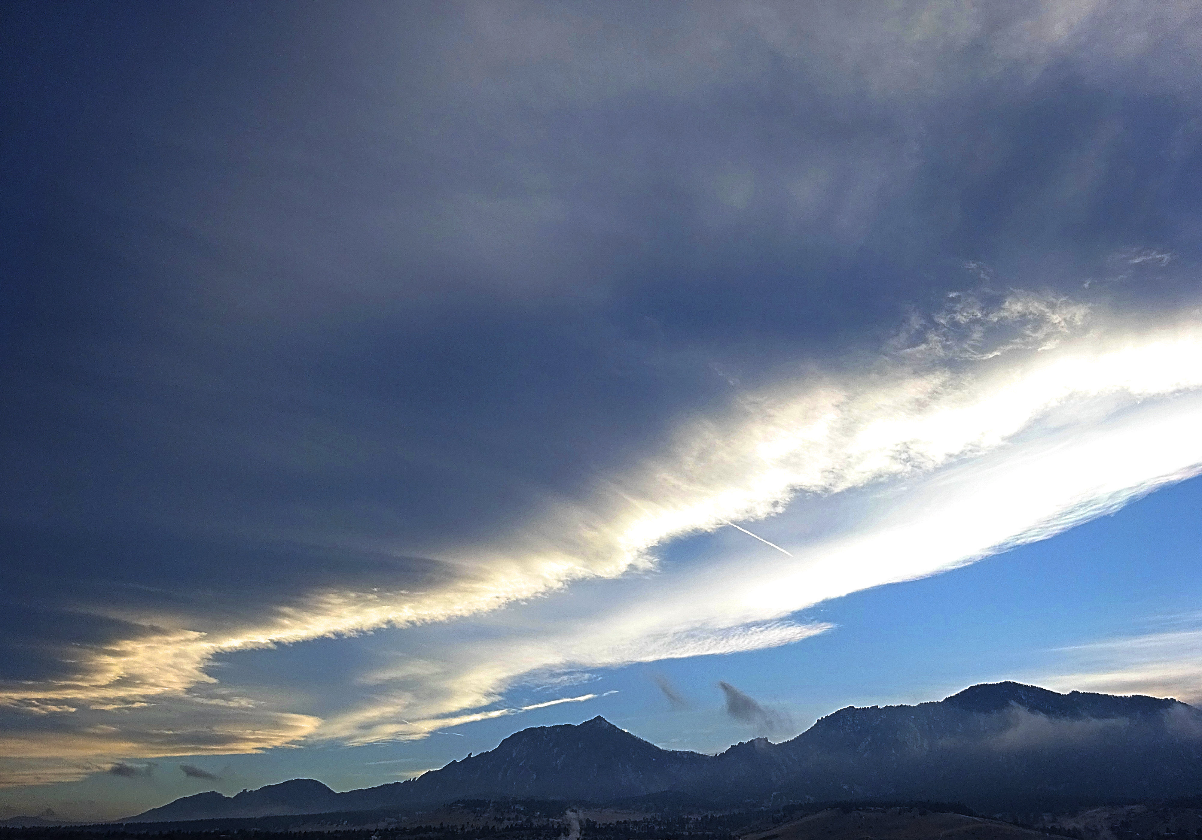 This image is highly dramatic due to the difference in scale between the Flatirons and the low hanging mountain wave cloud. That dark, stormy cloud is imposing and inspires a feeling of dread.
