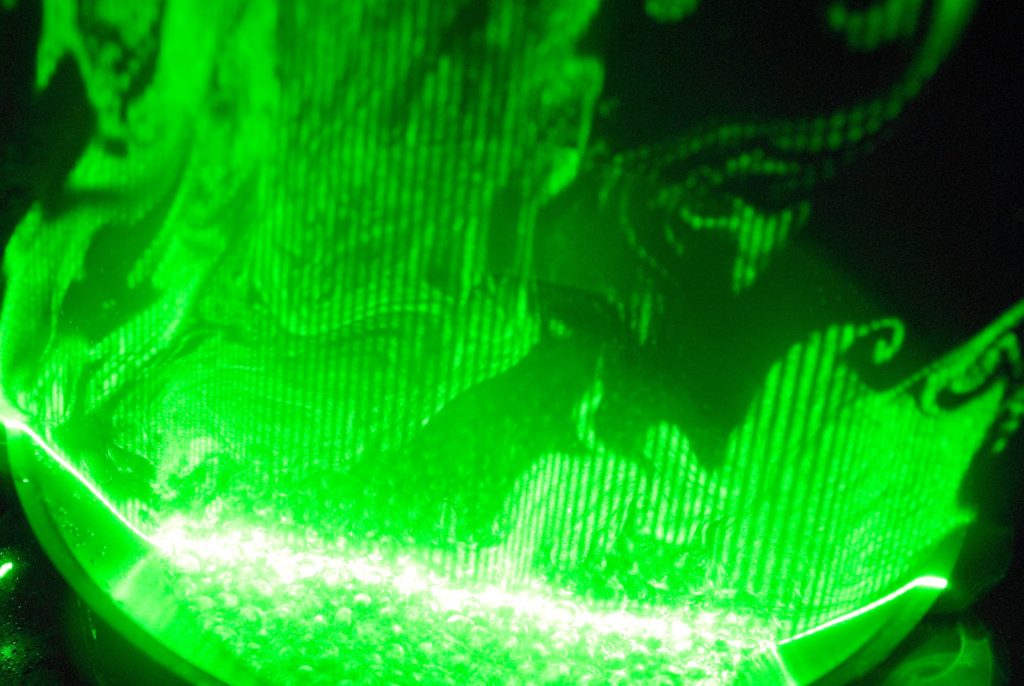 The flow shows a turbulent wake, this is a cloud of steam rising out of a pan that is boiling water. Instead of using a laser sheet this time, I just changed the shutter speed to 1.3 seconds and moved the laser along the pan so that it would capture light from the whole flow profile. This created the same laser sheet effect without any optics. This was a lot easier to do actually because I just setup my camera with a tripod, hit the capture button then moved the laser. There were a couple cool images. Also, I used a green laser this time because it is easier to see, also it’s more powerful than my purple one!