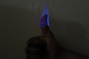 This post is certainly interesting and catches the eye. This image certainly demonstrates what happens when something is dipped in alcohol and lit on fire. The small area above the thumb that isn’t engulfed is interesting. The photo is pretty dark, however.