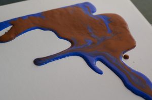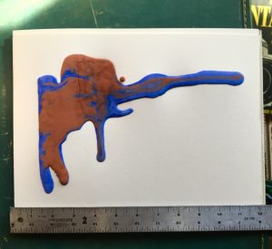 I made my oobleck from cups of cornstarch and one cup of water in a pint plastic container. To create the two colors of the oobleck, I mixed ½ cup of oobleck with about a tablespoon of artist pigment then mixed until the pigment was evenly dispersed. I set a 9” x 12”sheet of acrylic canvas on a table next to a window in my room. I then poured about ¼ cup of the blue oobleck onto the canvas. I then poured the red/brown oobleck on top of the blue and shifted the plane of the paper to make the two colors flow together across the page. Figure 1 has some lumpy texture near the pour spot. I wonder if my addition of pigment may have decreased the shear thickening force of the cornstarch.