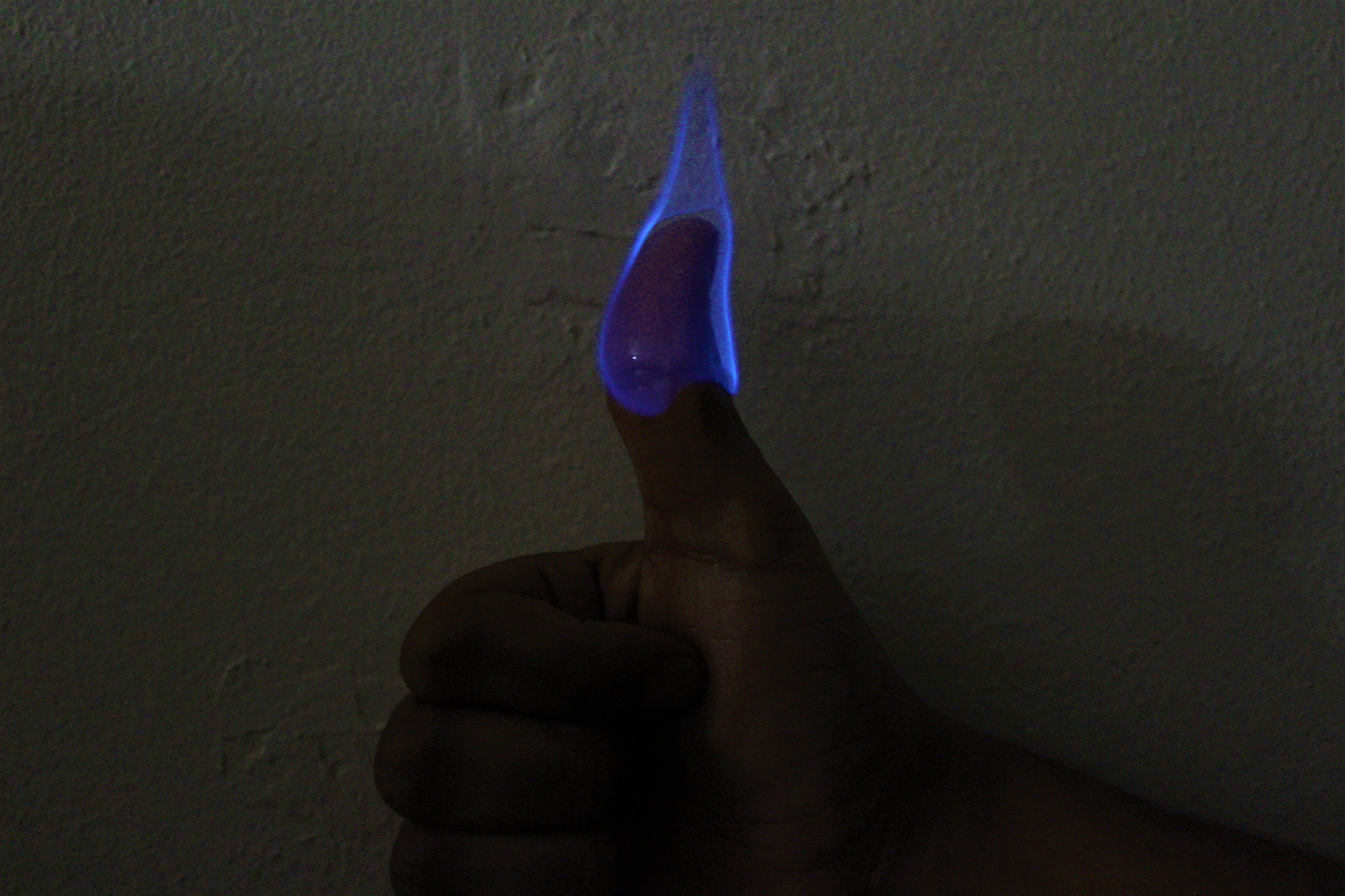 The effect of the blue flame against the darkened background is a dramatic one. Seeing your thumb on fire is immediately startling and noticing that you are giving a thumbs-up sign provides a sort of irony. The composition is fairly balanced, and my eyes have the tendency of moving upwards in this photo.