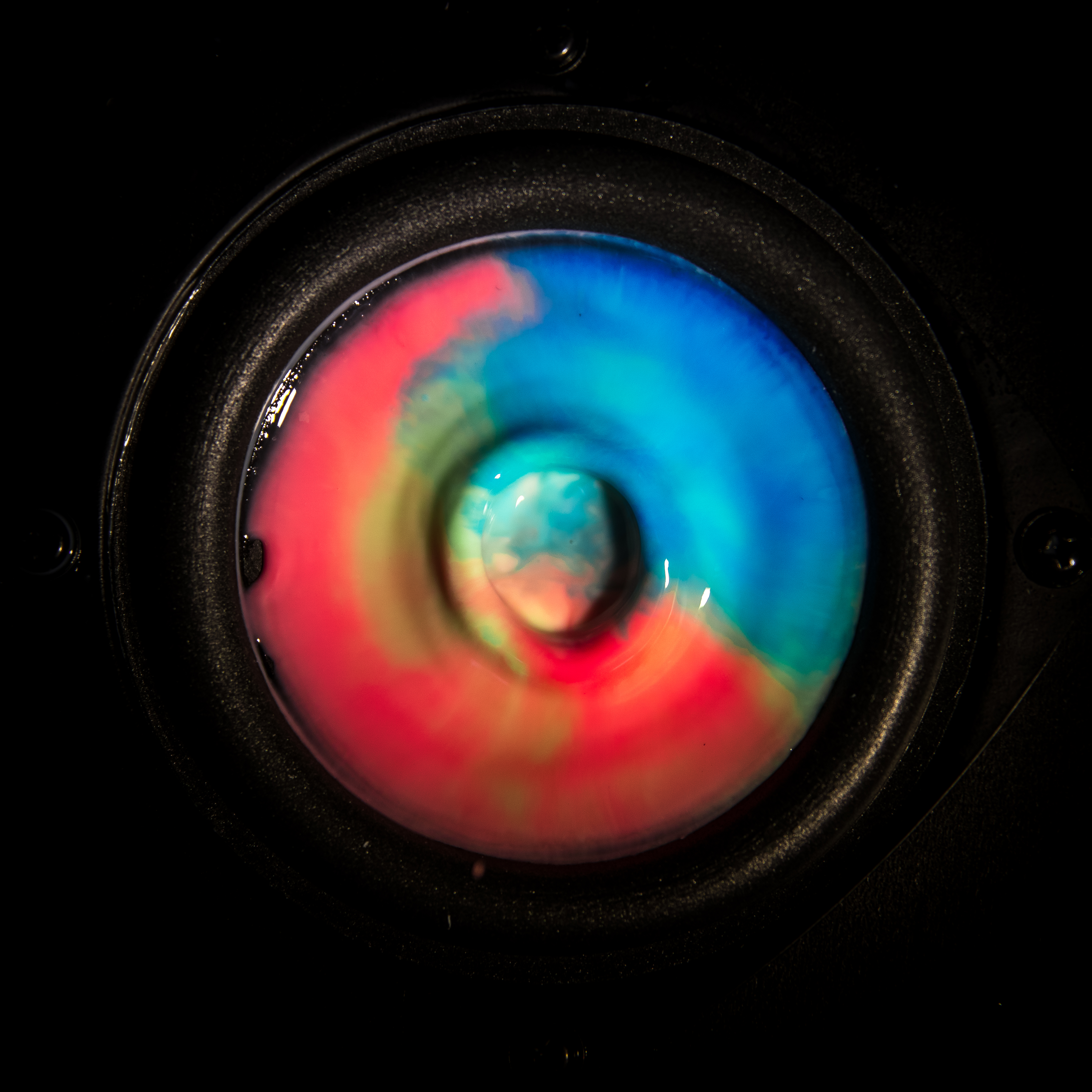 Great focus and contrast with both the fluid and speaker! It almost seems like it was glossed with tie dye, but the edges and blur show the fluid was not static.