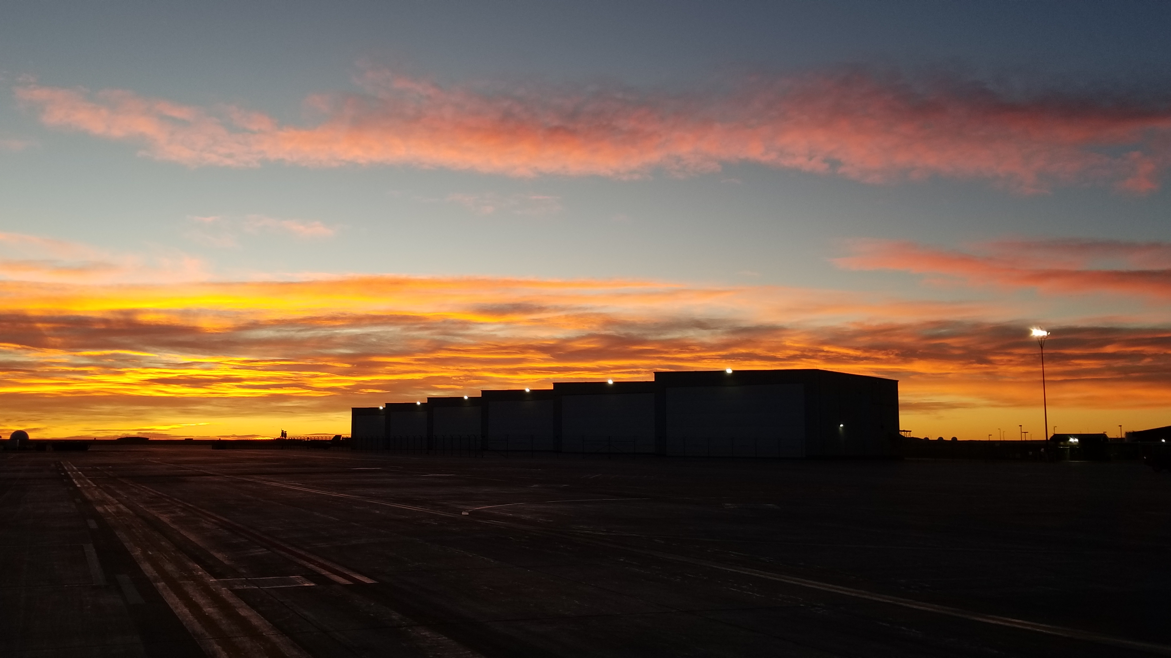 Really striking image! I love the sunrise colors in the clouds, and the contrast between the sunset and the silhouette of the hanger is fantastic.