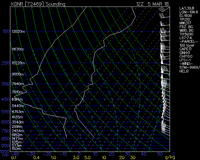 Skew T plot of Denver area in Colorado on March 5th 2018.