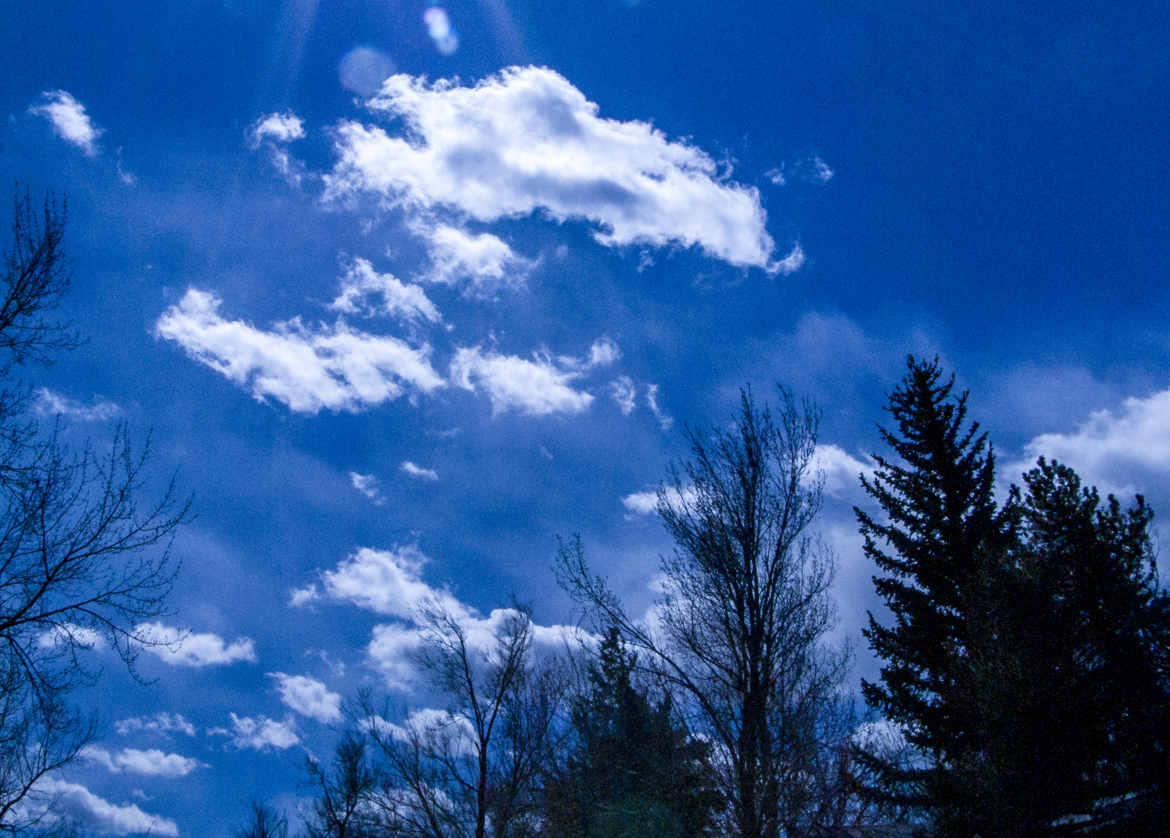I like the contrast between the white clouds and the blue sky, and the high number of clouds strewn throughout the sky. I also like the trees in the foreground.