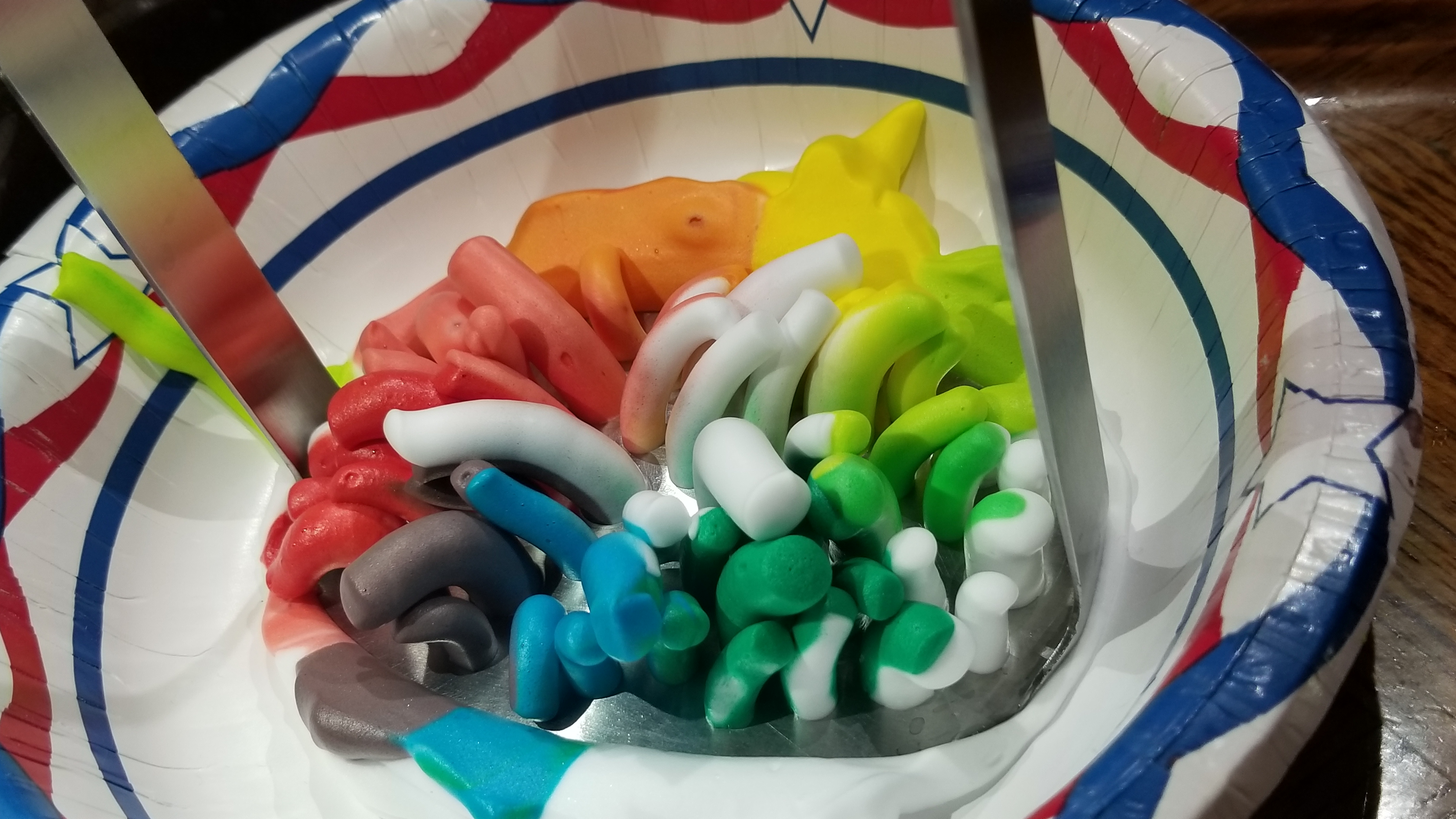 Gillette Foamy Shaving Cream dyed with Betty Crocker Food Coloring and then pressed down with a potato masher. I used iPhoto as my post-processing aid and simply cropped down the image and then used the Vignette filter to darken the corners. I darkened the corners to eliminate some of the distracting pieces of my original image, such as my potato masher and the paper bowl decorations.