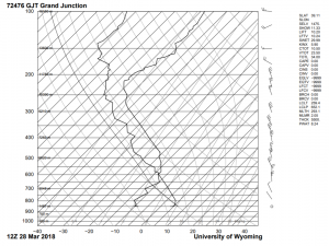 Cloud captured in Grand Junction, Colorado on March 28th. Conditions were stable. My guess for this cloud is stratocumulus based on low pinch in the Skew-T. Wind was coming from the North at fairly high speeds.