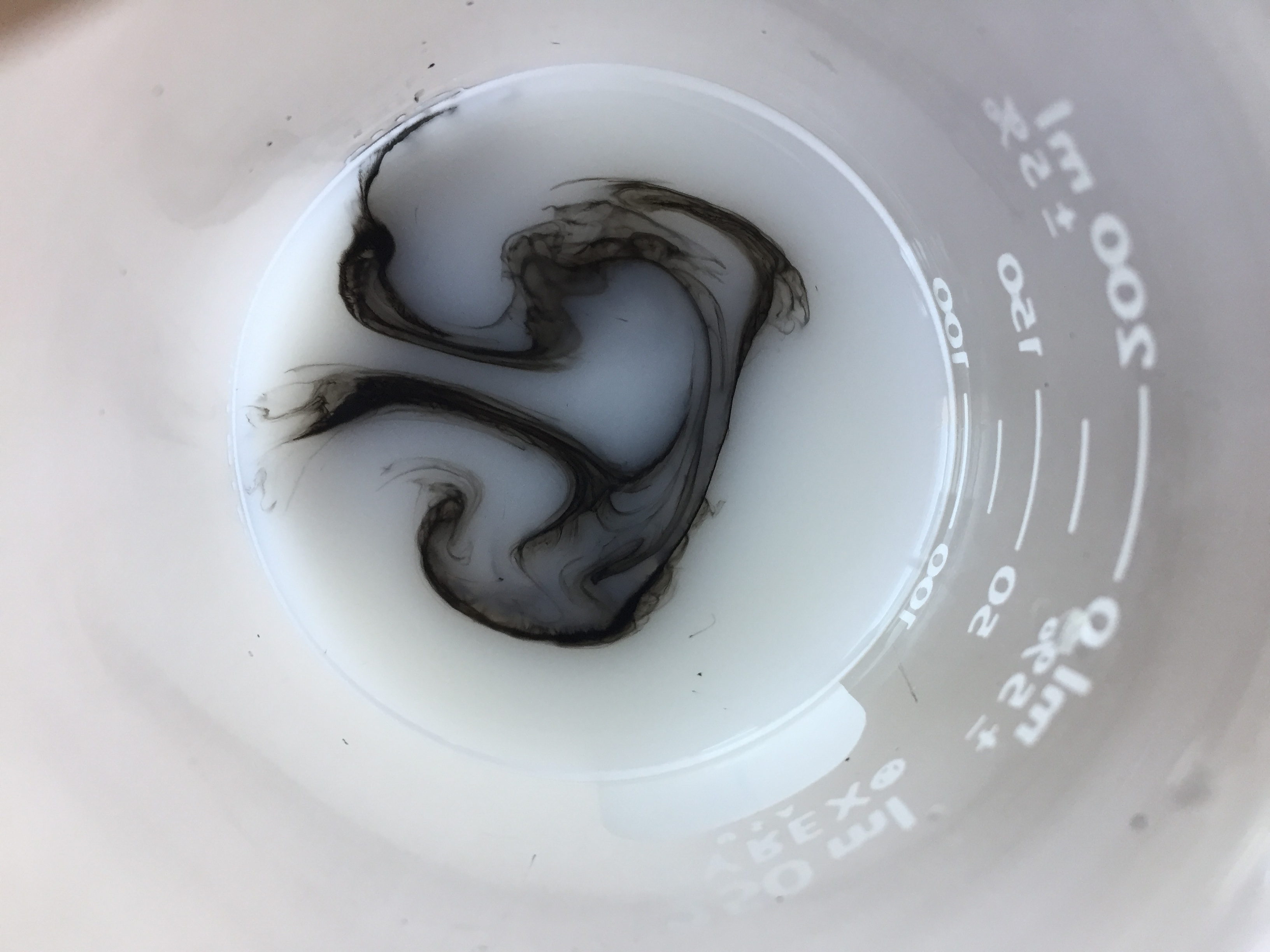 Black ink dropped into whole milk with no mixture.  The colors were inverted, sharpness and contrast were increased.