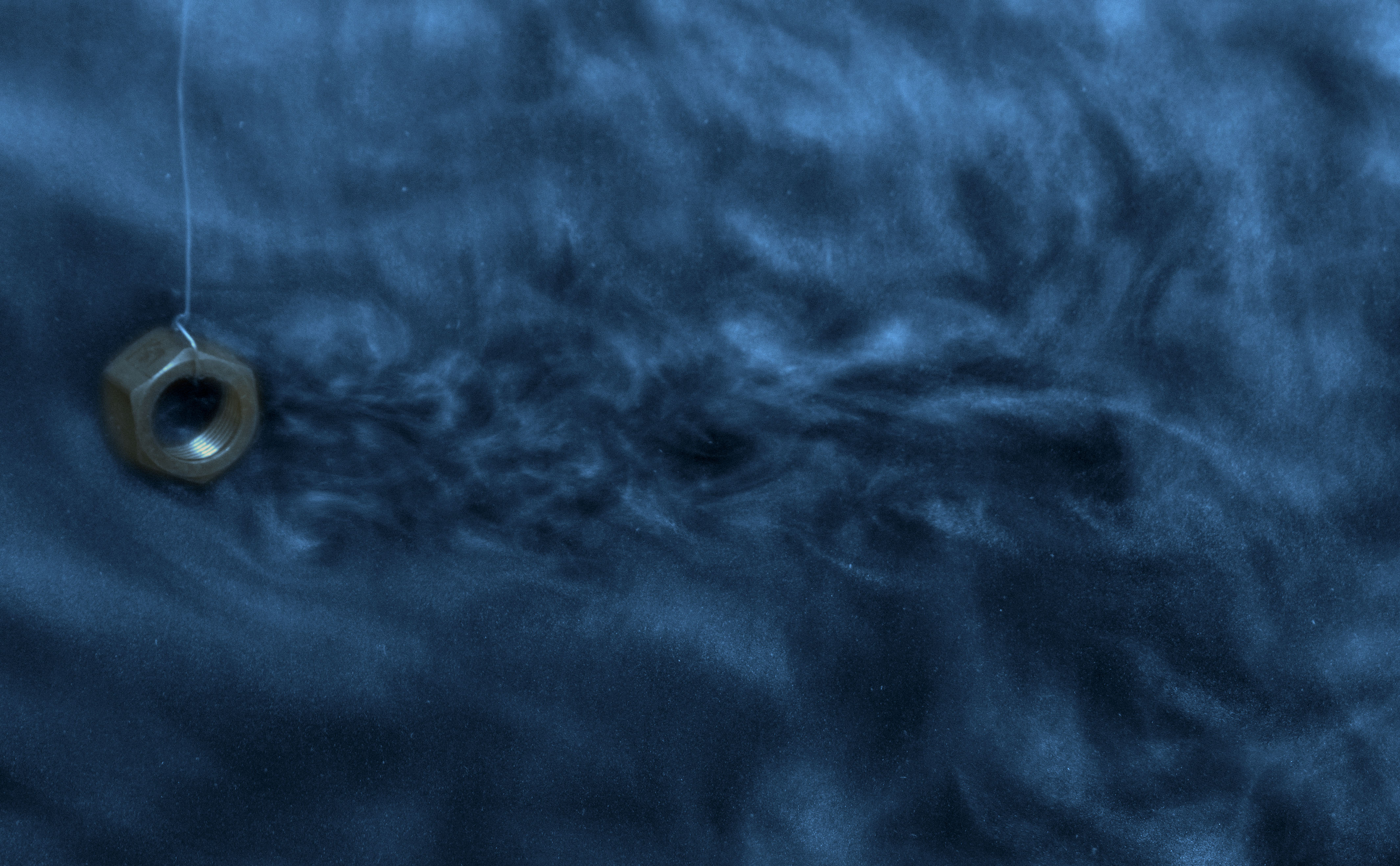 This turbulent flow visualization is really interesting to look at. The way the flow bends and flows around the nut is cool. The focus is well done, but the liquid looks pretty grainy.