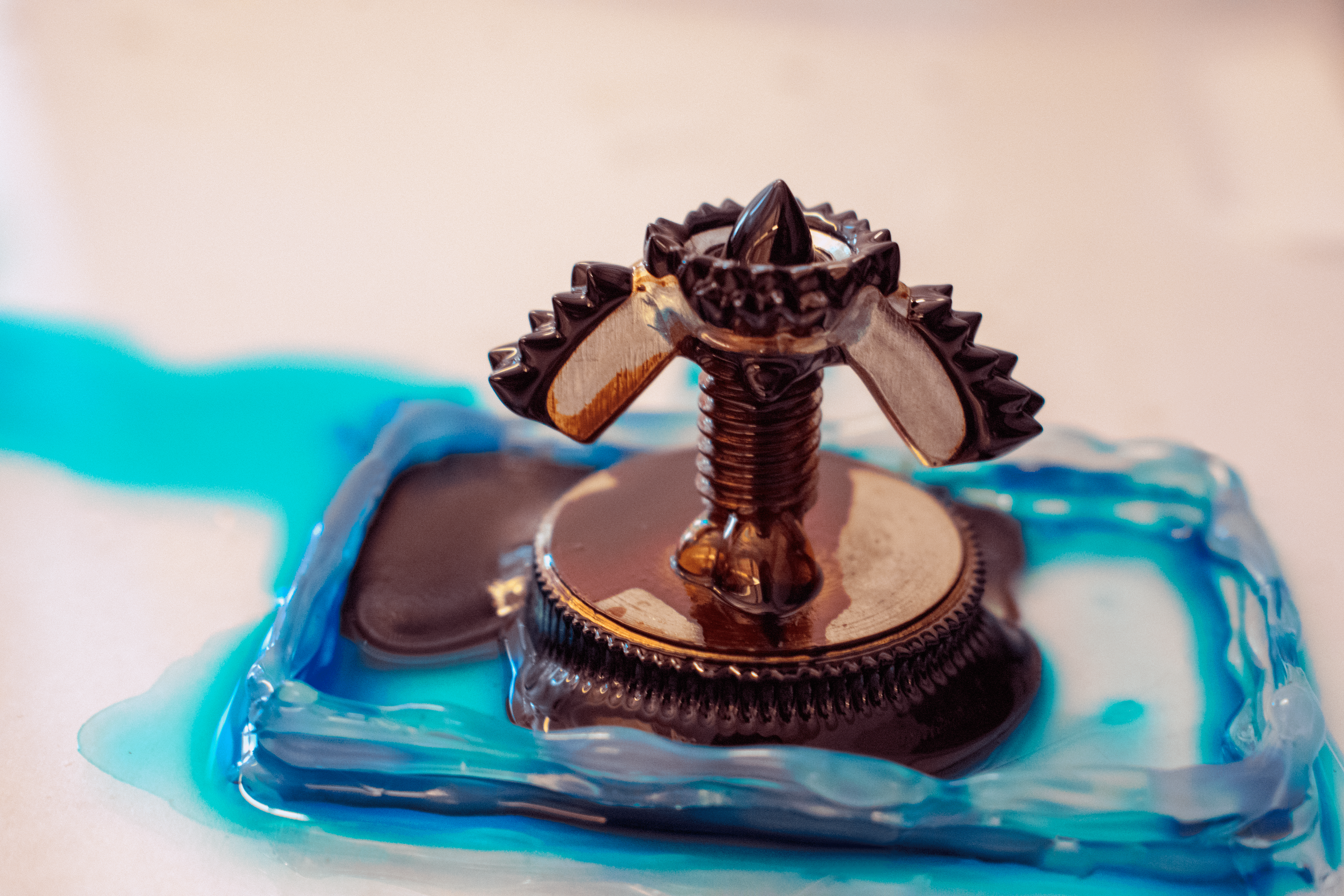 Great focus and depth of field in the image. I like how the ferrofluid has a similar color to the wing nut. Great color contrast.