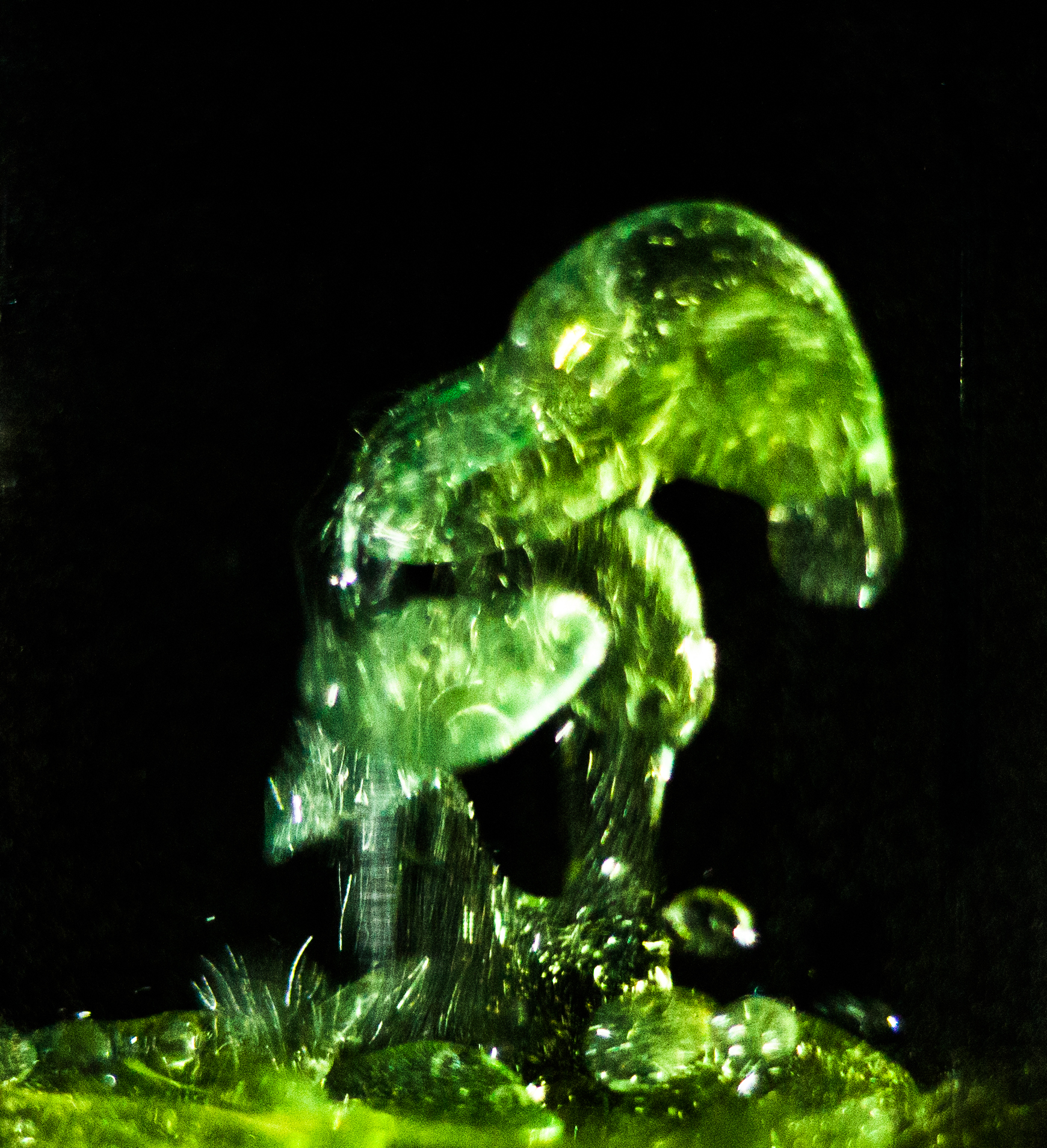 This image shows how oil and water interact in a unique and interesting way. The green oil is repelled from the clear water, resulting in a no-mixing condition. Note that the image is flipped upside down.