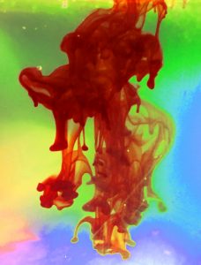 This was created using food coloring in heavily salted water so that the densities were a very close match. Color balance for the background was changed to make it more interesting.