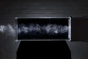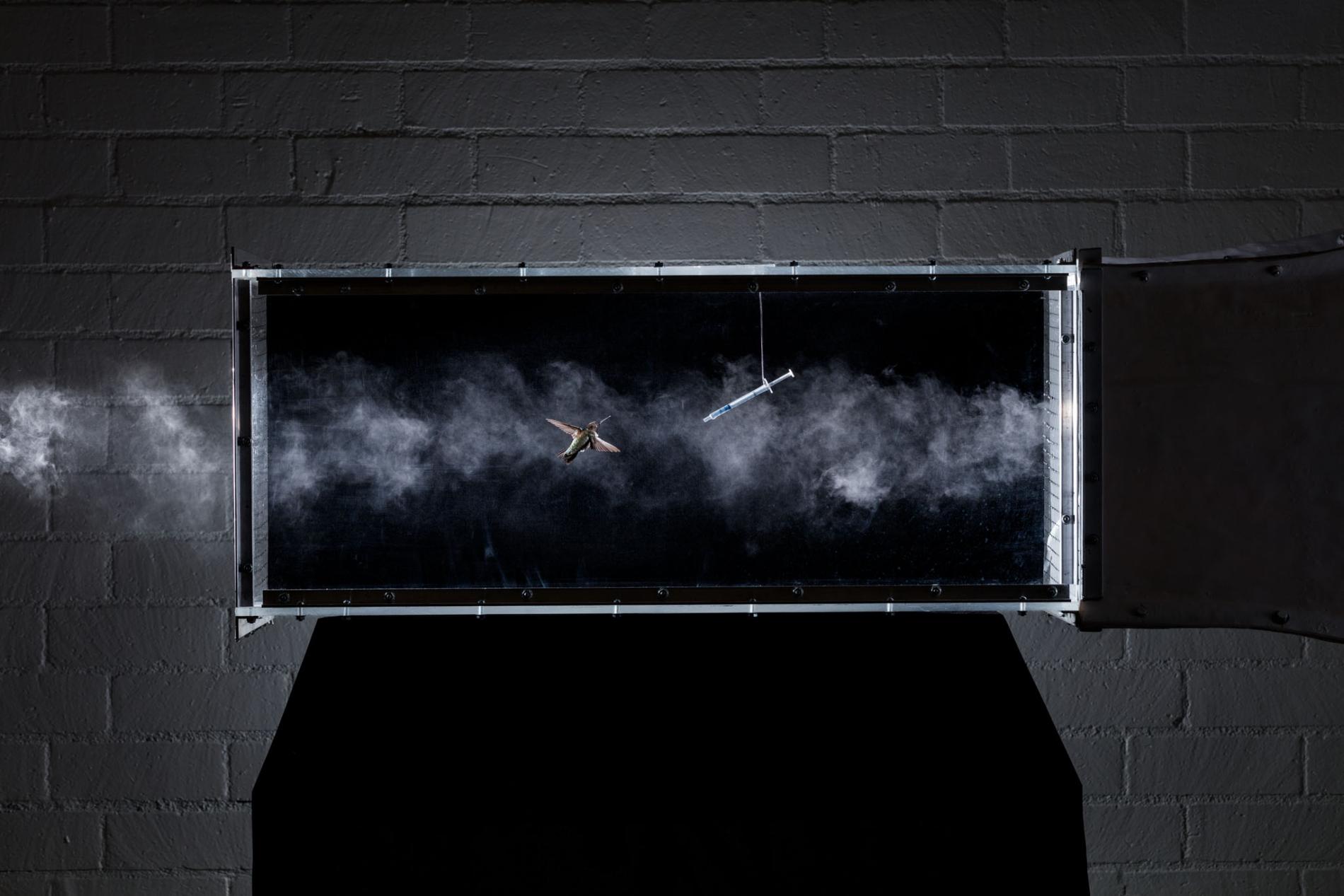 This is a bird inside a wind tunnel, the water vapor shows the flow of the wind movement in wind tunnel.