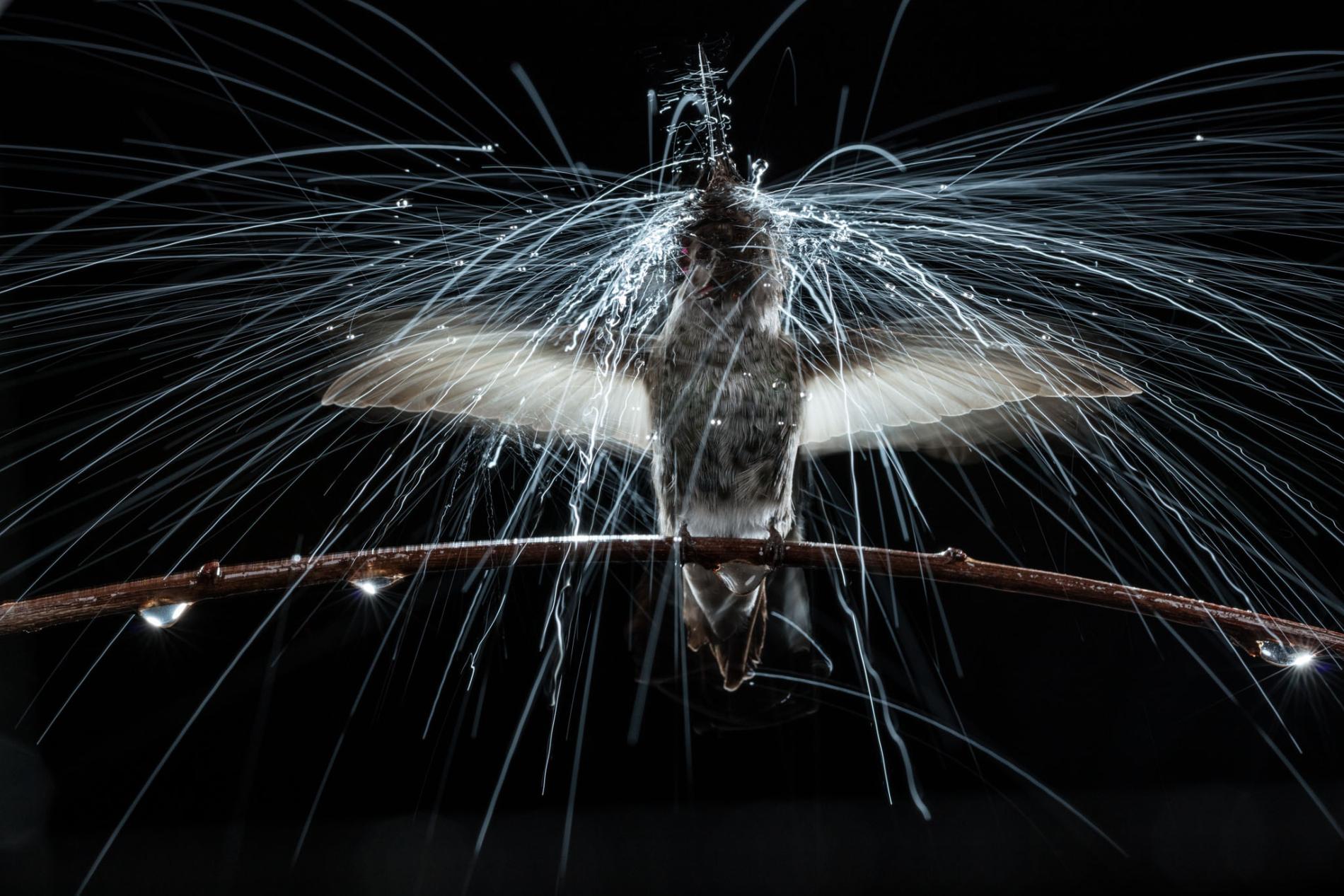 Hummingbirds often brave downpours to gather the nectar needed to avoid starvation. This hummingbird shakes off rain as a wet dog does, with an oscillation of its head and body.