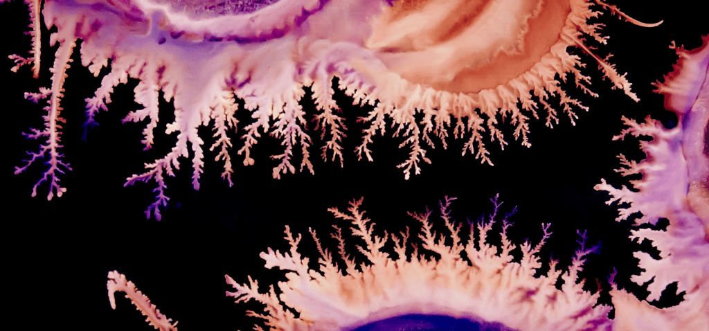 “Dyed isopropyl alcohol atop a thin layer of acrylic medium spreads in a fractal fingering pattern. Although the shapes are reminiscent of the viscous fingers seen in in the Saffman-Taylor instability, these patterns are most likely a result of surface tension. The lower surface tension of the alcohol causes Marangoni forces to pull it outward. The branching shapes indicate an instability, likely driven by surface tension, but the details of the mechanism behind it are unclear. (Image credits: J. Nahabetian)”