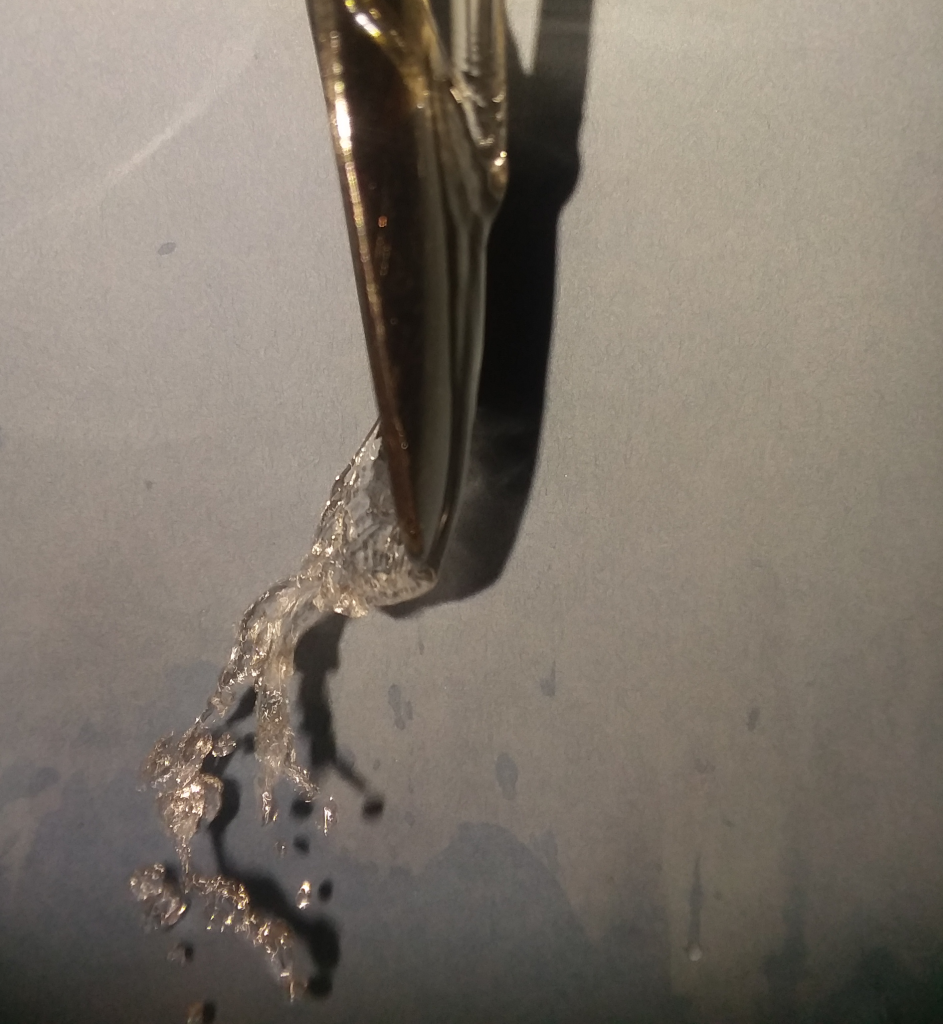 The contrast of the shadow and the reflection of the water gives an interesting frame to the flow. It allows for the flow to be accentuated against the light background. It might be an interesting analysis to go over curve flow across the spoon and the flow phenomena.