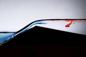 As the second project and first one as a team, “Team First” is intended to improve our skills by using all the ideas and tools of each team member. Everyone can help with more complex fluid flow and with a setup that requires multiple moving parts. Our goal was to create an image of a wave from a side view, but we weren’t set on any specific way of making this happen. Professor Hertzberg suggested that we use the CU Boulder ITLL Building flume (explained later). When we finally used it, we found that we could dam up water, then release it all at once and make it hit a wall at the far end, creating a wave. Hana is a master with the camera and took photos from her tripod. Eli was out “Lighting guy” and Ibrahim was our food coloring dropper. I would dam the water and then give a countdown of when I would release it. This allowed Ibrahim to drop the food coloring at the correct moment and informed Hana of when to start taking photos. After taking many photos of the wave, we wanted to try some other things. We found a pyramid shaped block that water could flow over and just had some fun dropping food coloring to see what happened. It turns out that it looked very cool, so I decided to take my photos of this and make some small adjustments to get a good demonstration of the physics and get a superb photo. Thus, it ended up that the rest of the team chose the wave photos, while I chose this flow photo, although the setup was nearly identical.
