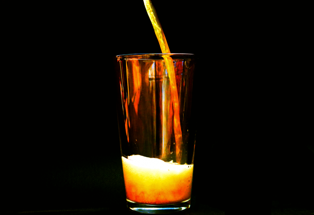 I like how everything is a shade of the orange beer or black. The centered glass within the frame provides a good amount of symmetry. Some of the highlights look a little washed out but the important parts are clearly visible.