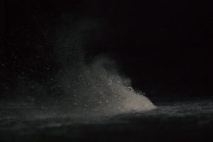 All of the images in our series were taken in a small conference room with the fluorescent lights off so that we could control shadows more effectively. As the main light source for these photos, we used a large LED panel to provide very even light with minimal shadows and the panel also allowed us to tune the brightness and hue. A roll of black paper of width 3′ was placed on a table to serve as the surface for our pile of chalk and another piece of black paper was secured to the wall behind the table to provide a black backdrop for the images. For this image, Bison brand climbing chalk was poured onto the surface and formed into a small pile about 5″ in diameter and 3″ tall. A large text book was then dropped from an approximate height of 3′ onto the table surface just out of frame to the right of the chalk pile. This generated a relatively large impulse wave of air that washed over the chalk, creating the flow seen in this image. The camera was operated in a high speed burst mode to capture as many pictures as possible in the short time span that this event was occurring.